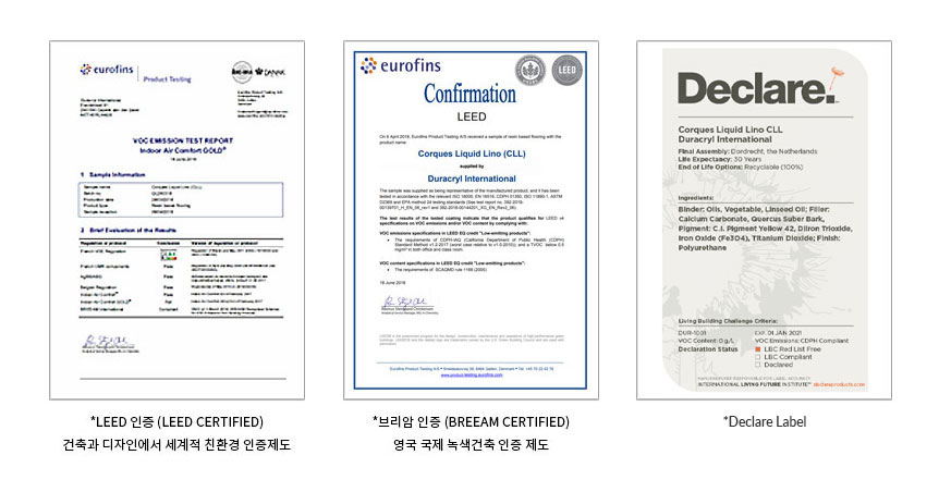 Corques Liquid Lino®๋ ๋ค์๊ณผ ๊ฐ์ ๊ตญ์ ์นํ๊ฒฝ ์ธ์ฆ์ ๋ณด์ ํ๊ณ ์์ต๋๋ค.